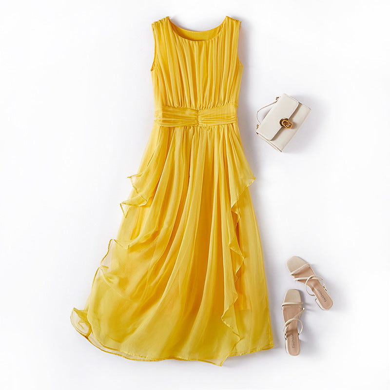 Introducing our Sleeveless Mulberry Silk Dress, crafted with the finest silk fabric for a luxurious feel. The unique pleating technique adds an exquisite touch to the design, making it a standout piece in your wardrobe. This ankle-length dress features an irregular hem, creating a dynamic and eye-catching silhouette.